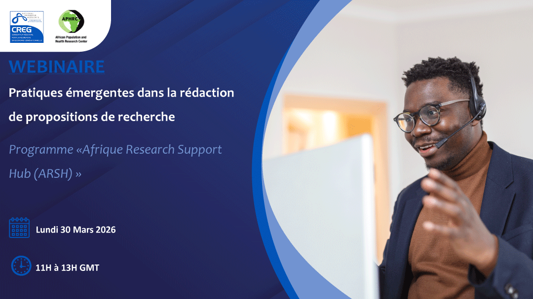 Dr Camille GUIDIME, représentant du CREG, prendra part au webinaire virtuel organisé par l’APHRC sur le thème : « Pratiques émergentes dans la rédaction de propositions de recherche » 🗓 Lundi 30 mars 2026⏰ 11h–13h GMT💻 Session virtuelle 🎯 Il partagera son expertise sur la conceptualisation de recherches multidisciplinaires, les partenariats localisés et l’intégration de l’impact sociétal dans la recherche. Aux côtés de lui : Dr Sokhna Thiam (APHRC) Mme Diama Diop Dia DJIGO (APHRC) 👉 Une session enrichissante autour des nouvelles approches de la recherche, de l’inclusion et de la durabilité. Lien d’inscription: https://us02web.zoom.us/webinar/register/WN_0kNnpE0uQWCLl5cQoyetIw X-twitter Facebook-f Linkedin