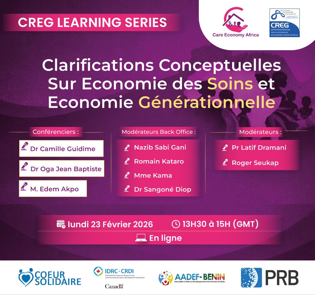 Titre : Clarifications Conceptuelles sur l’Économie des Soins et l’Économie GénérationnelleDate : Lundi 23 février 2026Heure : 13h30 – 15h00 GMT 🎯 Objectif généralRenforcer les connaissances et compétences des participants sur les approches conceptuelles de l’économie des soins et de l’économie générationnelle. 🏆 Résultats attendusÀ l’issue du webinaire, les participants auront :• Une compréhension claire des concepts d’économie des soins et d’économie générationnelle.• La capacité de décrire les changements démographiques au niveau individuel et structurel.• Les outils pour analyser et expliquer les impacts liés aux deux approches économiques. 👥 Public cible• Les parties prenantes du projet « Soutenir l’élaboration de politiques fondées sur les données probantes pour l’équité intergénérationnelle au Togo et au Bénin ».• Toute personne intéressée par l’économie des soins et l’économie générationnelle. 🎙️ Intervenants• Modérateurs : Roger Seukap, Dr Oga Jean Baptiste• Modérateurs Back Office : Mme Kama, Dr Sangoné, Nazib Sabi Gani, Romain Kataro• Conférenciers : Dr Camille Guidime, Edem Akpo 👉 Ne manquez pas cette opportunité d’approfondir vos connaissances sur deux concepts clés pour la planification du développement et l’équité intergénérationnelle.