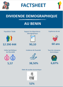 Le présent factsheet met en exergue la mesure du potentiel économique de la population au Bénin au regard de sa structure par âge. La dépendance économique, les contributions aussi bien des femmes que des hommes à la création du revenu du travail sont essentiellement mises en évidence. Le niveau exploité du potentiel économique de la population aussi bien des femmes que des hommes est renseigné par l’indice de suivi du dividende démographique. Enfin, il est décrit de manière probante comment sont alloués les ressources budgétaires au profit des politiques et programmes pour la capture du dividende démographique.