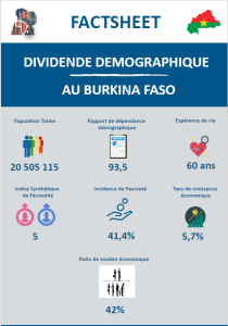 Le présent factsheet met en exergue la mesure du potentiel économique de la population au Burkina Faso au regard de sa structure par âge. La dépendance économique, les contributions aussi bien des femmes que des hommes à la création du revenu du travail sont essentiellement mises en évidence. Le niveau exploité du potentiel économique de la population aussi bien des femmes que des hommes est renseigné par l’indice de suivi du dividende démographique. Enfin, il est décrit de manière probante comment sont alloués les ressources budgétaires au profit des politiques et programmes pour la capture du dividende démographique.