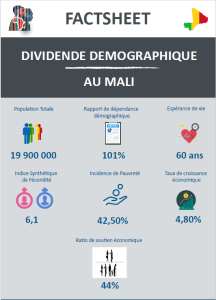 Le présent factsheet met en exergue la mesure du potentiel économique de la population au Mali au regard de sa structure par âge. La dépendance économique, les contributions aussi bien des femmes que des hommes à la création du revenu du travail sont essentiellement mises en évidence. Le niveau exploité du potentiel économique de la population aussi bien des femmes que des hommes est renseigné par l’indice de suivi du dividende démographique. Enfin, il est décrit de manière probante comment sont alloués les ressources budgétaires au profit des politiques et programmes pour la capture du dividende démographique.