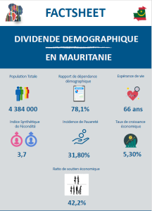 Le présent factsheet met en exergue la mesure du potentiel économique de la population en Mauritanie au regard de sa structure par âge. La dépendance économique, les contributions aussi bien des femmes que des hommes à la création du revenu du travail sont essentiellement mises en évidence. Le niveau exploité du potentiel économique de la population aussi bien des femmes que des hommes est renseigné par l’indice de suivi du dividende démographique. Enfin, il est décrit de manière probante comment sont alloués les ressources budgétaires au profit des politiques et programmes pour la capture du dividende démographique.
