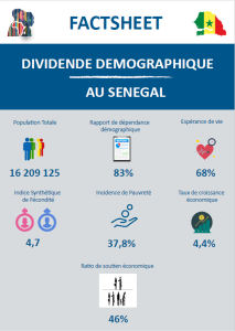 Le présent factsheet met en exergue la mesure du potentiel économique de la population au Sénégal au regard de sa structure par âge. La dépendance économique, les contributions aussi bien des femmes que des hommes à la création du revenu du travail sont essentiellement mises en évidence. Le niveau exploité du potentiel économique de la population aussi bien des femmes que des hommes est renseigné par l’indice de suivi du dividende démographique. Enfin, il est décrit de manière probante comment sont alloués les ressources budgétaires au profit des politiques et programmes pour la capture du dividende démographique.