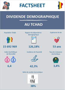 Le présent factsheet met en exergue la mesure du potentiel économique de la population au Tchad au regard de sa structure par âge. La dépendance économique, les contributions aussi bien des femmes que des hommes à la création du revenu du travail sont essentiellement mises en évidence. Le niveau exploité du potentiel économique de la population aussi bien des femmes que des hommes est renseigné par l’indice de suivi du dividende démographique. Enfin, il est décrit de manière probante comment sont alloués les ressources budgétaires au profit des politiques et programmes pour la capture du dividende démographique.