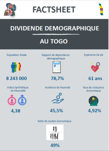Le présent factsheet met en exergue la mesure du potentiel économique de la population au Togo au regard de sa structure par âge. La dépendance économique, les contributions aussi bien des femmes que des hommes à la création du revenu du travail sont essentiellement mises en évidence. Le niveau exploité du potentiel économique de la population aussi bien des femmes que des hommes est renseigné par l’indice de suivi du dividende démographique. Enfin, il est décrit de manière probante comment sont alloués les ressources budgétaires au profit des politiques et programmes pour la capture du dividende démographique