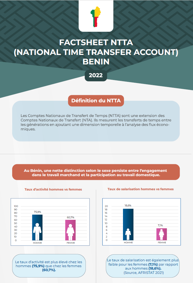 La feuille de faits stylisés fournit les données probantes sur l’analyse sexo-spécifique de la production marchande et de la production domestique au Bénin. Le temps facilite la conversion uniforme de toutes activités quelques soit leurs natures. La production globale des femmes et des hommes en fonction des disparités de milieu de résidence est évaluée. La valeur du travail invisible ou encore de la production de soins familiaux non rémunérés est apprécié par rapport au produit intérieur brut (PIB).