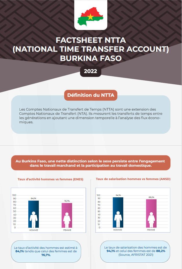 La feuille de faits stylisés fournit les données probantes sur l’analyse sexo-spécifique de la production marchande et de la production domestique au Burkina Faso. Le temps facilite la conversion uniforme de toutes activités quelques soit leurs natures. La production globale des femmes et des hommes en fonction des disparités de milieu de résidence est évaluée. La valeur du travail invisible ou encore de la production de soins familiaux non rémunérés est apprécié par rapport au produit intérieur brut (PIB).