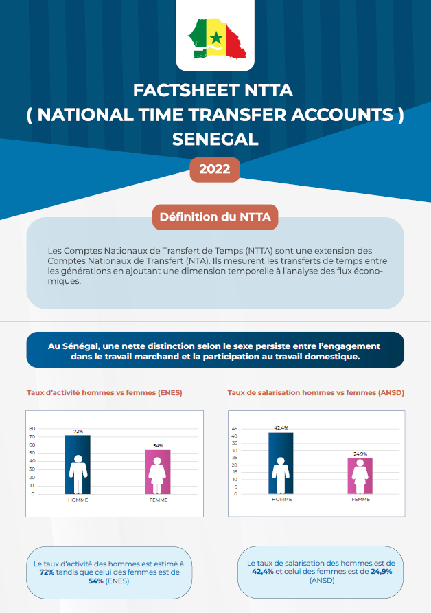 La feuille de faits stylisés fournit les données probantes sur l’analyse sexo-spécifique de la production marchande et de la production domestique au Sénégal. Le temps facilite la conversion uniforme de toutes activités quelques soit leurs natures. La production globale des femmes et des hommes en fonction des disparités de milieu de résidence est évaluée. La valeur du travail invisible ou encore de la production de soins familiaux non rémunérés est apprécié par rapport au produit intérieur brut (PIB).